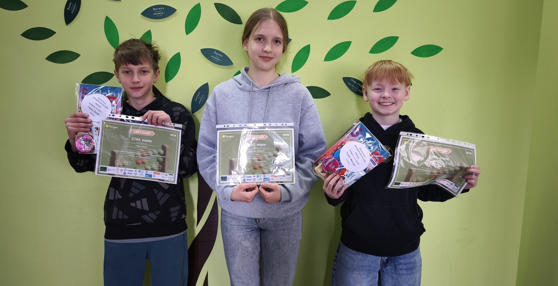 Tito žáci obdrželi certifikáty se svými výsledky a drobné odměny v podobě balíčků se sladkostmi a dárky. Toto předání proběhlo z rukou ředitele školy Mgr. Petra Jurase. Děkujeme všem žákům za snahu a nejúspěšnějším blahopřejeme.