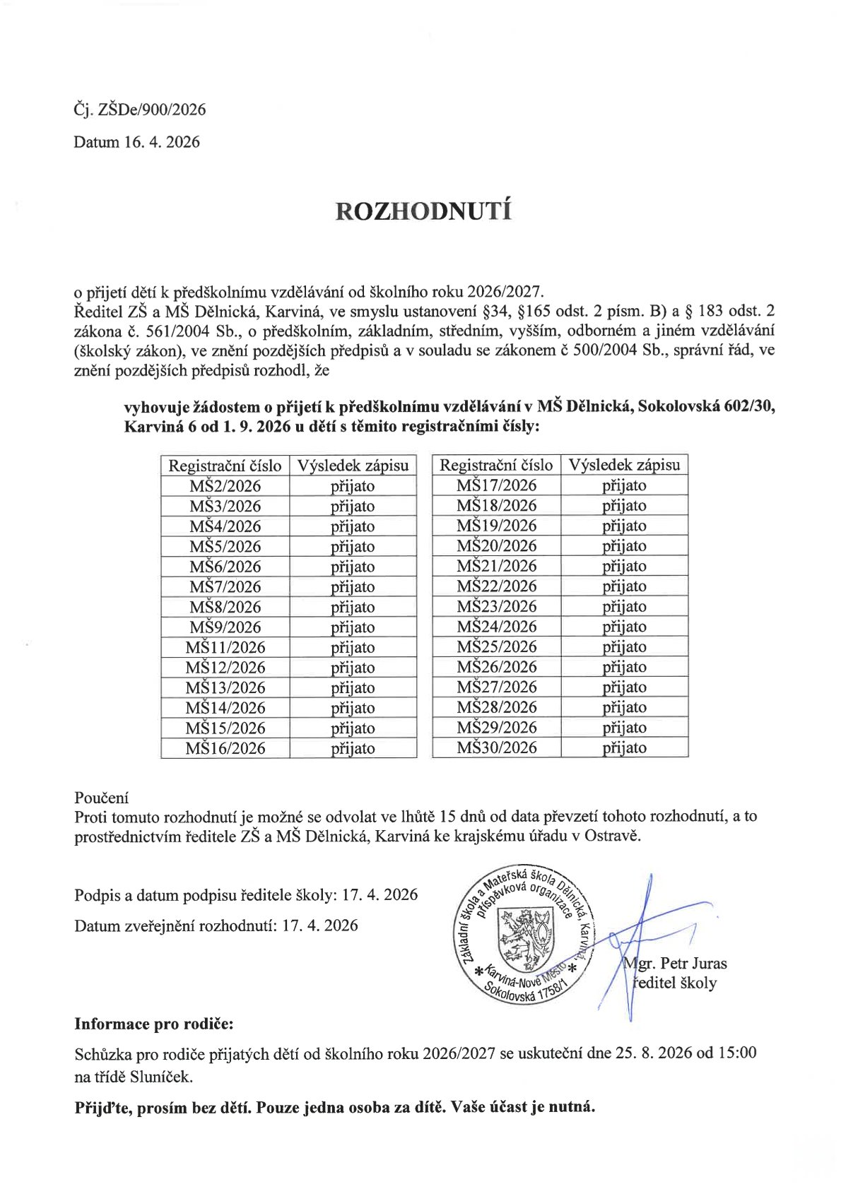 Rozhodnutí o přijetí dětí k předškolnímu vzdělávání od školního roku 2026/2027.