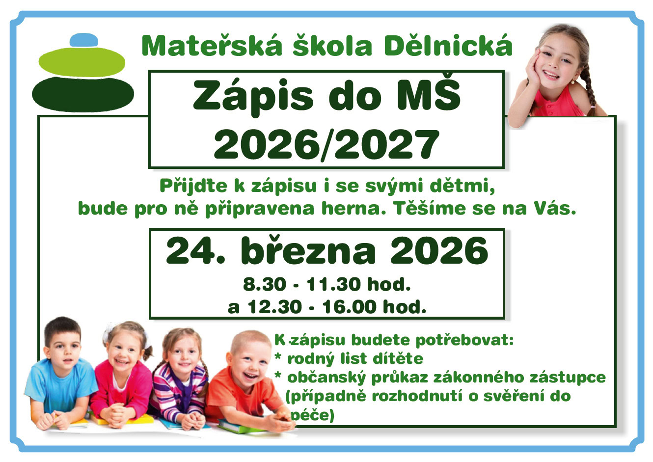 Zápisy do MŠ 2026/2027 se konají v úterý 24. března 2026. Přijďte k zápisu se svými dětmi, bude pro ně připravena herna.